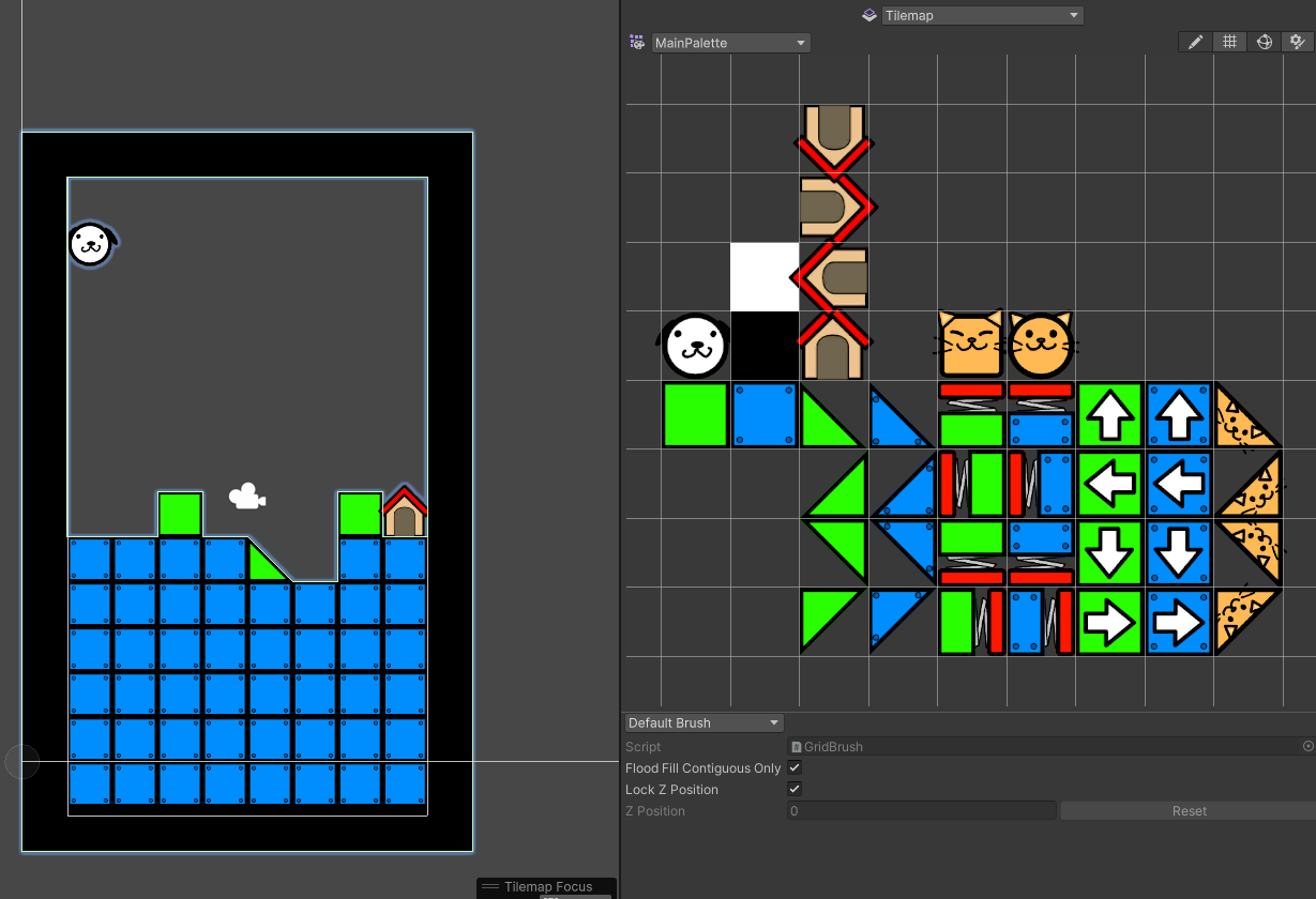 ただ図形を置いていくだけならUnityのTilemap機能のままで実装できるのですが、上の画像のように、犬とかネコとかバネとかゴールとか、動かせるブロックとかを配置して、それが動いたり動かせたりしたいときはどうにかそういう仕組みを考えて処理をつくる必要があります。ありました。あるはず。