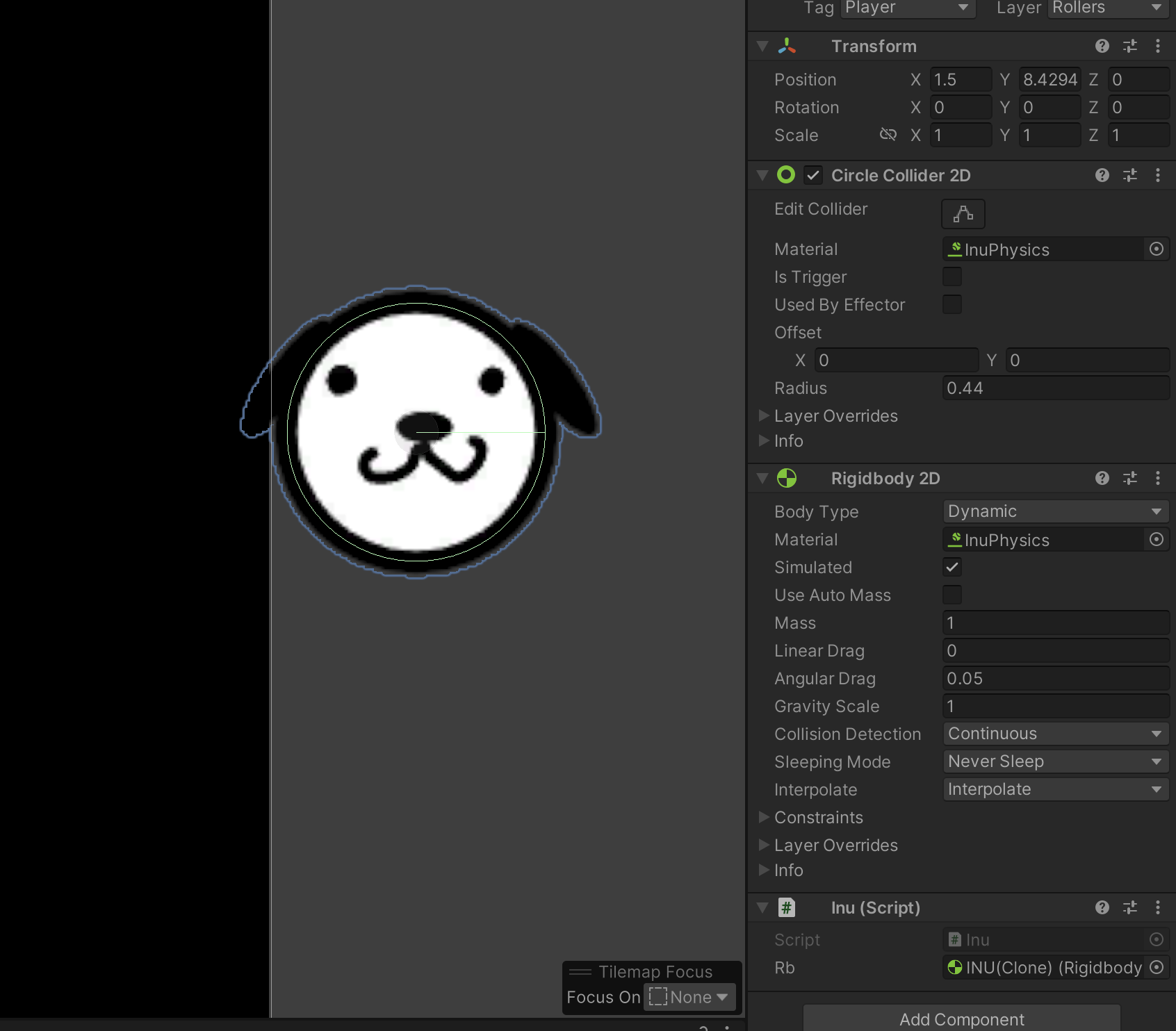 物理挙動については各オブジェクト(犬とかネコ)のRigidBody2Dパラメータを、ひたすらに調整します。