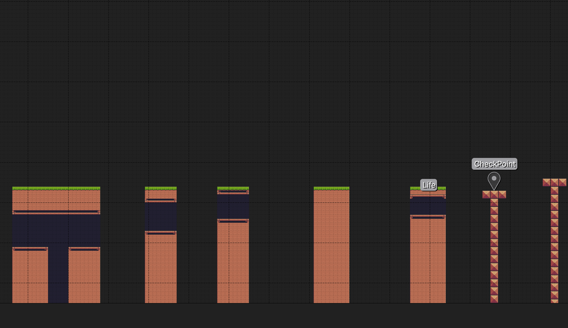 上の画像はCheckPointという名前のオブジェクトを置いているところです。名前は自分でつけることができます。 おじさんがここを通ると、チェックポイント通過という扱いになり、おじさんが死んだときにここへ戻ってこれます。